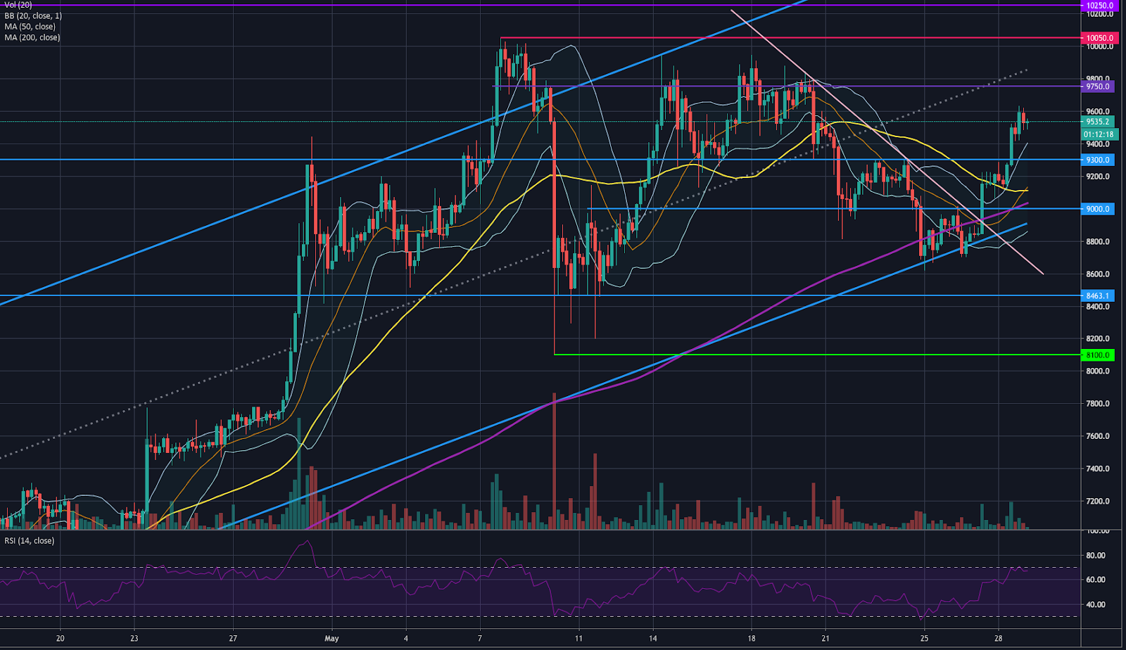 Bitcoin made a decisive move on Thursday, after breaking above $9.300 and creating a large candlestick on an increasing volume that touched the $9,500 level. The price continues to move above the +1 sigma line, showing an excellent bullish momentum as the Bollinger bands expanded and headed towards the north. The RSI is touching the 70 level after ascending from the $0 level.