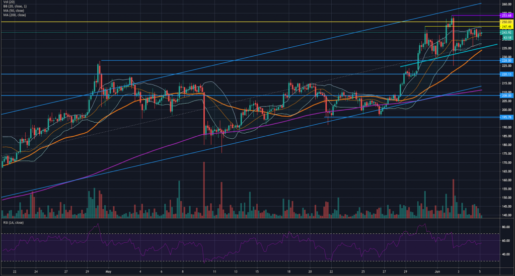 Как уже говорилось, Ethereum приостанавливает свое восходящее движение. Цена приближается к трем уровням сопротивления (247,46, 250 и 353,7), затрудняя трейдерам, если весь рынок не движется в унисон.