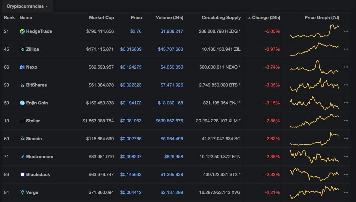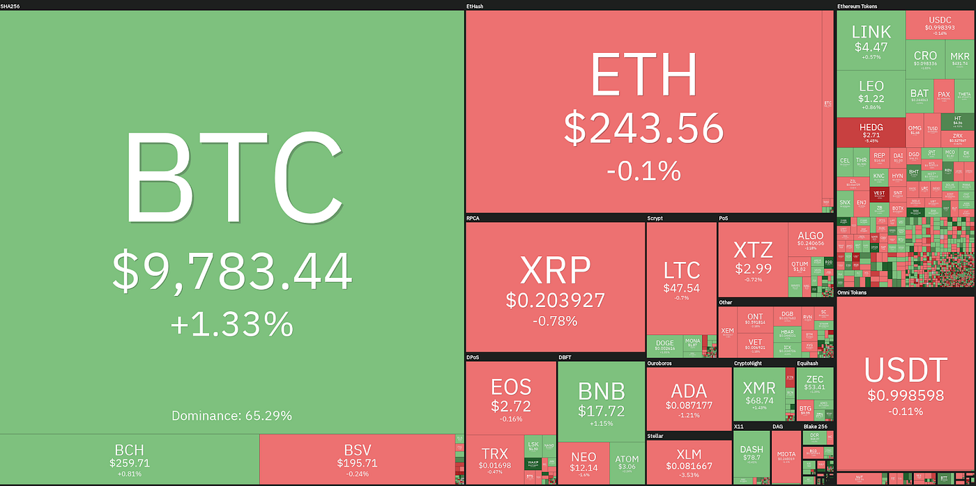 Bitcoin вырос на 1,33% по сравнению с предыдущим значением 24 часа назад, так как большинство монет в основном плоские и стоят выше 9 750. Ethereum (-0,1%) консолидирует свои предыдущие успехи, в то время как Ripple (-0,78%) продолжает двигаться вбок, не в силах набраться сил для достижения новых максимумов. На токенах на основе Ethereum HEDGE откатился на 5% после 40% подъема за два дня, таких как лидерство WAX (+ 54%), CHSB (+ 32,16%), UCT (+ 28,1%) и DRGN (+ 24%) достижения в этом секторе.