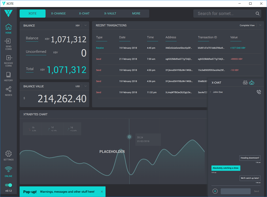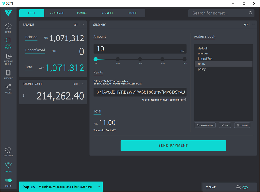 Our XCITE development team has been hard at work on improving the client. Therefore, we are delighted to release v0.1.2 of XCITE that can now be connected to the current testnet wallet via Remote Procedure Call (RPC). Below is a picture of the testnet wallet, NOT to be confused with the official XTRABYTES Wallet where you store real XBY.