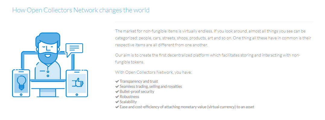 Now we're going to talk about the open a collectors network ICO and of course we'll begin with simply what is Open collectors network they are a decentralized exchange for one-of-a-kind tokens most of the really key words there is for tokens which are one-of-a-kind.