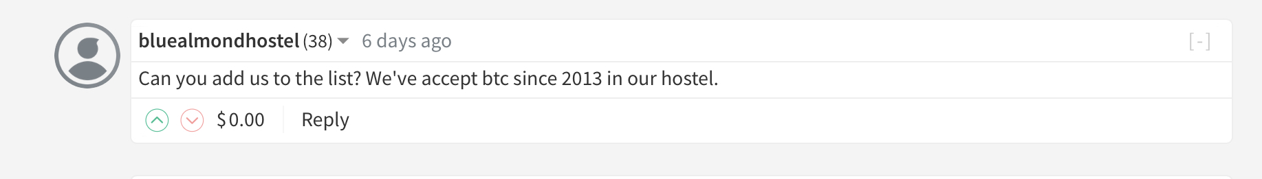 Can you add us to the list? We've accept btc since 2013 in our hostel.