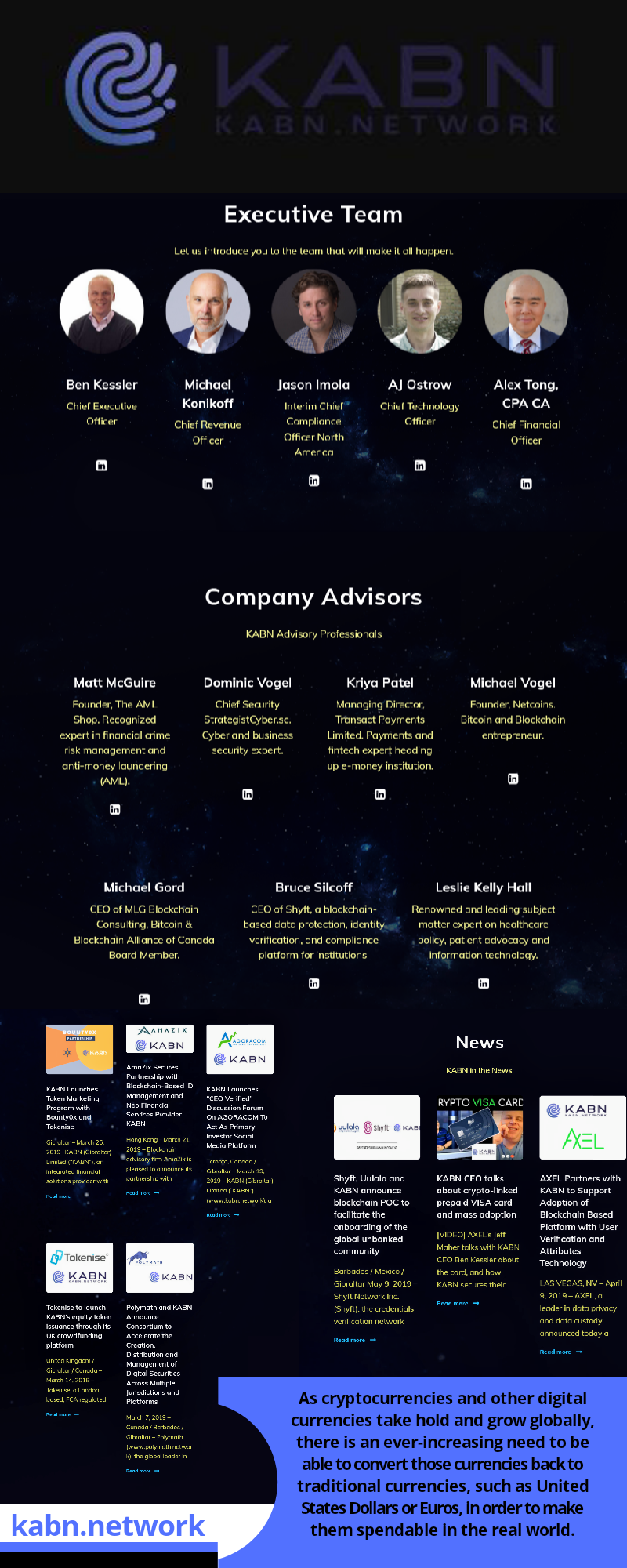 The KABN Network is an integrated suite of financial services that includes the Pegasus Flyte Visa Card, an approved crypto-linked prepaid Visa card and mobile integrated multi-currency banking wallet; KABN KASH, a robust loyalty and engagement program and the network anchor, KABN ID, a patent pending, Always On, GDPR compliant, blockchain and biometrically based, identity verification and validation platform. KABN ID is free to use service for consumers and provides continuous monitoring and proof of identity online and in conventional marketplaces.