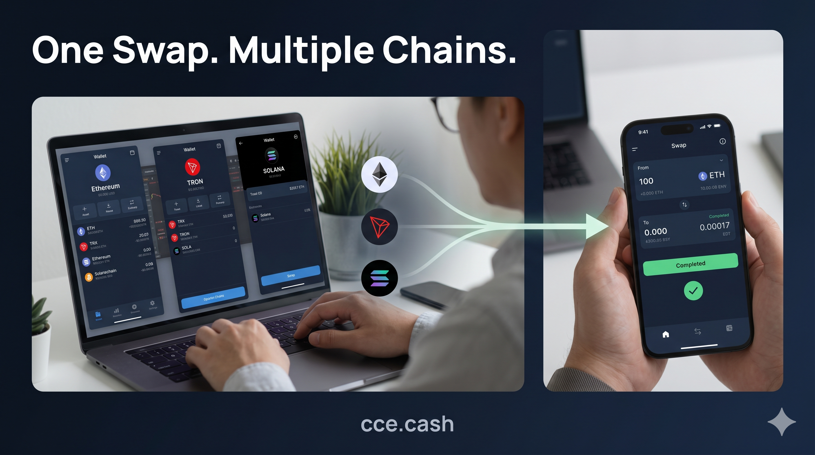 CCE Cash provides a fully automated exchange system that enables cross-chain swaps without requiring registration. Users enter a wallet address, select currencies, and complete the exchange in a few steps.
