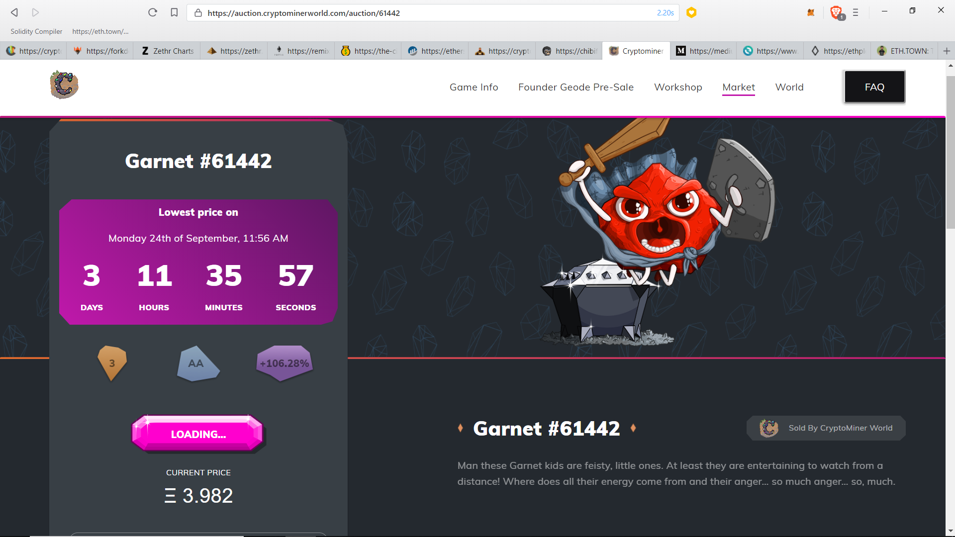The development of CryptoMinerWorld is moving right along. Phase 2 opens up the market. In this first week, there will just be this AA Gem for sale. After this auction ends, they will roll out the market for everyone to buy/sell Gems. So now if you missed the Founder's sale, you will have a chance to get your hands on a Gem. If you just can't wait, you can enter below to win a Gem from me.