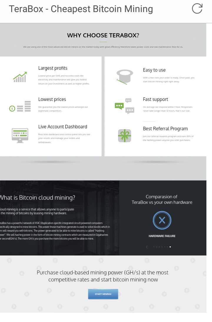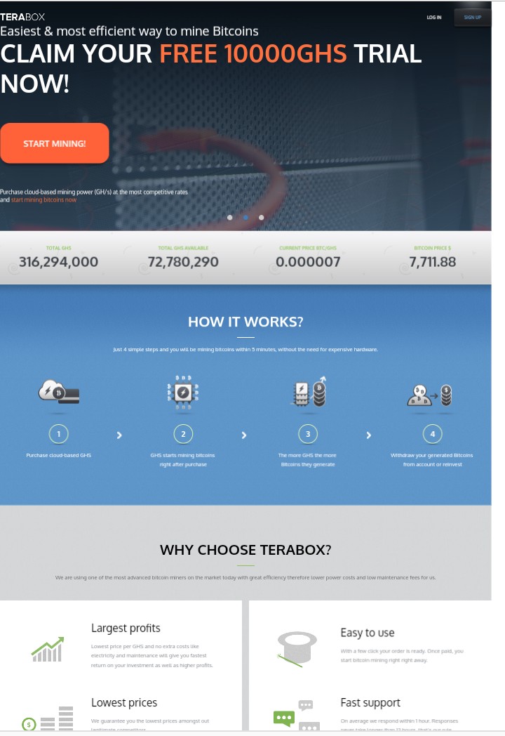 TeraBox has a powerful network of ASIC (Application-specific integrated circuit) powered computers specifically designed to mine bitcoins. The power those machines generate is used to solve blocks which in turn will reward you with bitcoins. The power generated to be able to mine bitcoins is called “Hashing Power”. We sell hashing power in the form of bitcoin mining contracts which are measured in Gigahashes per second(GH/s). The more GH/s you purchase the more bitcoins you will be able to mine