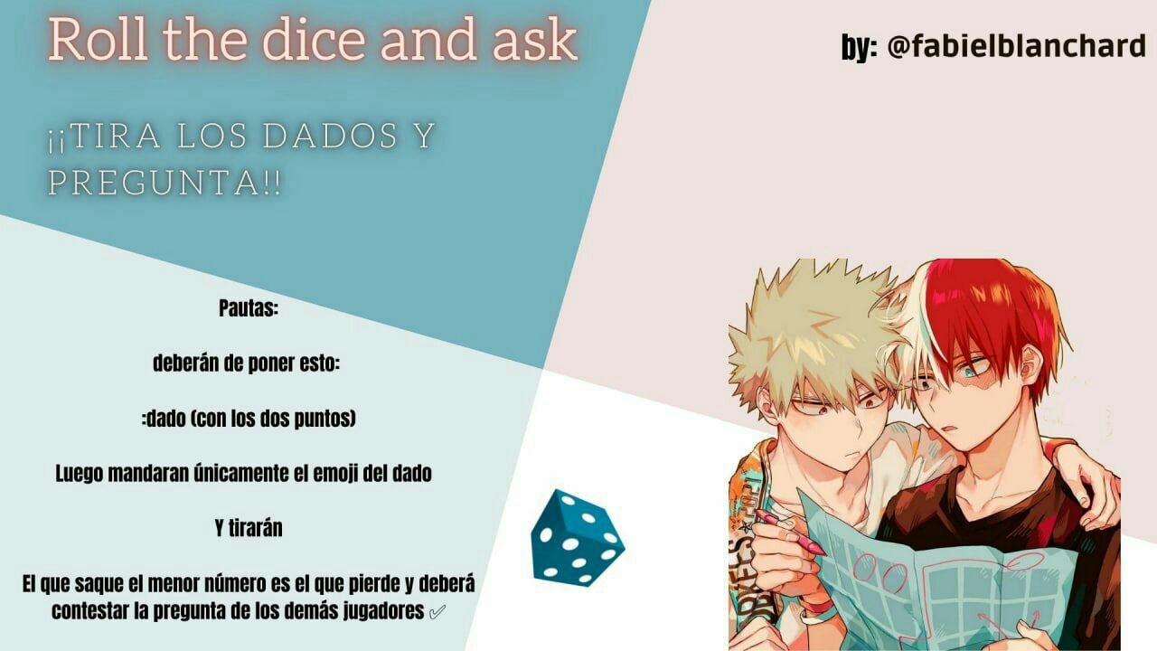 Bueno, esto es una dinámica para dejar fluir nuestra imaginación y también para conocernos algo más, por eso se le llamó: "Roll The Dice And Ask", qué al español significa: "Tira El Dado Y Pregunta". Esto consiste en que los jugadores tirarán del dado que la app de Telegram nos provee como si fuéramos nosotros los que tiran un dado en la vida real. Al tirar del dado, este mismo, después de girar un cierto período de tiempo pondrá un número al azar (1, 2, 3, 4, 5 y 6). El que saque el número 6 ya está libre de que le pregunten y ese será uno de los que pueden hacer 2 preguntas.