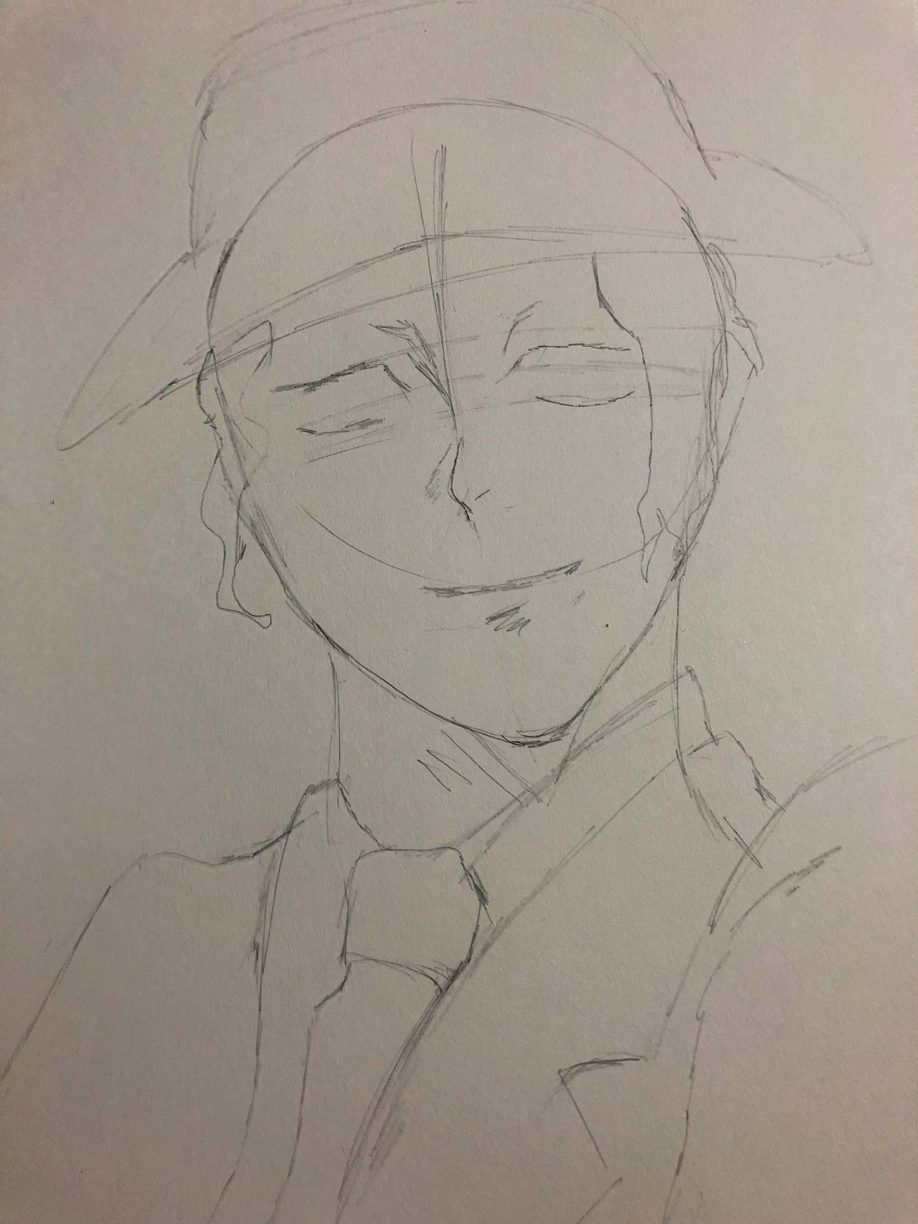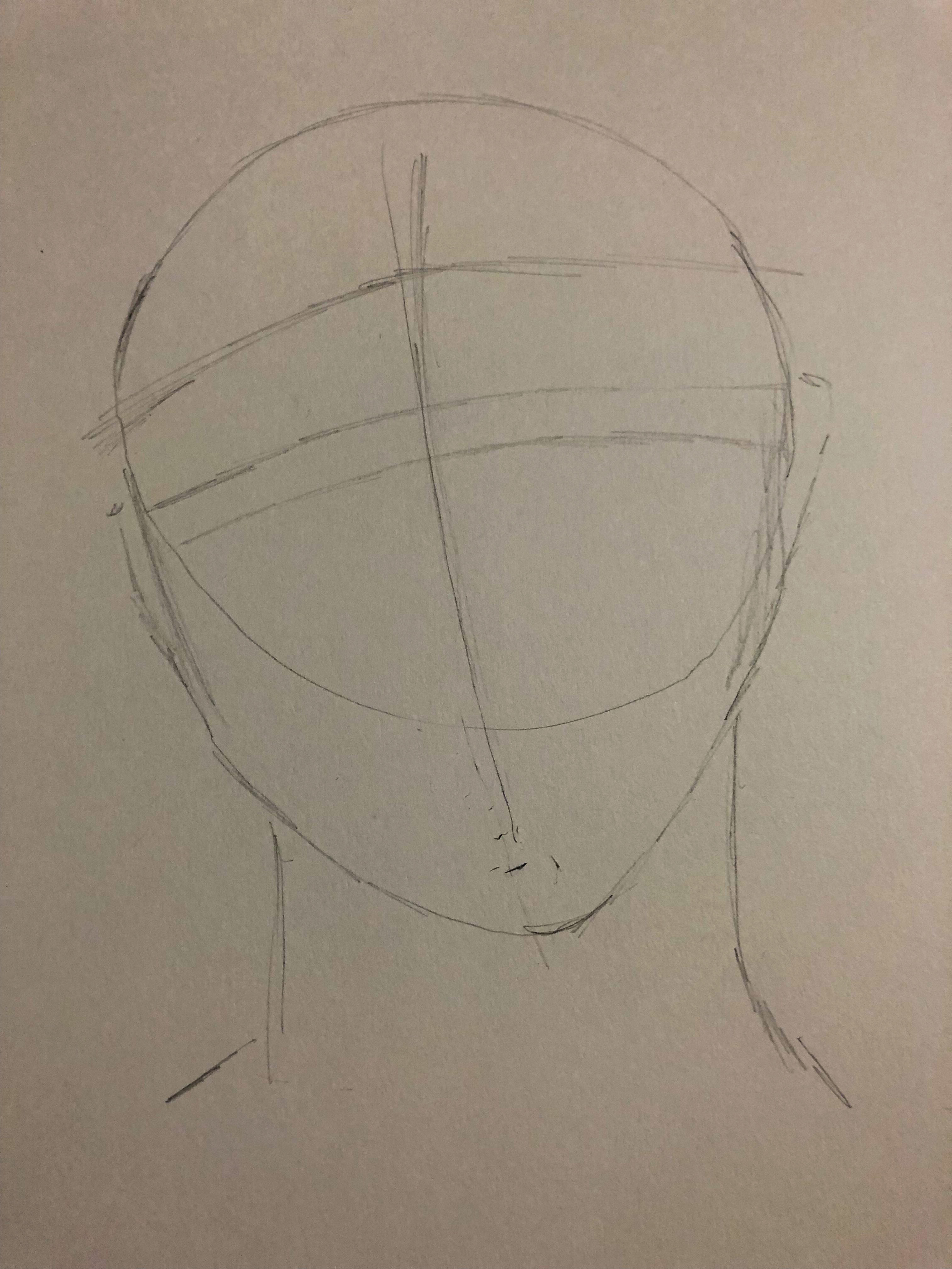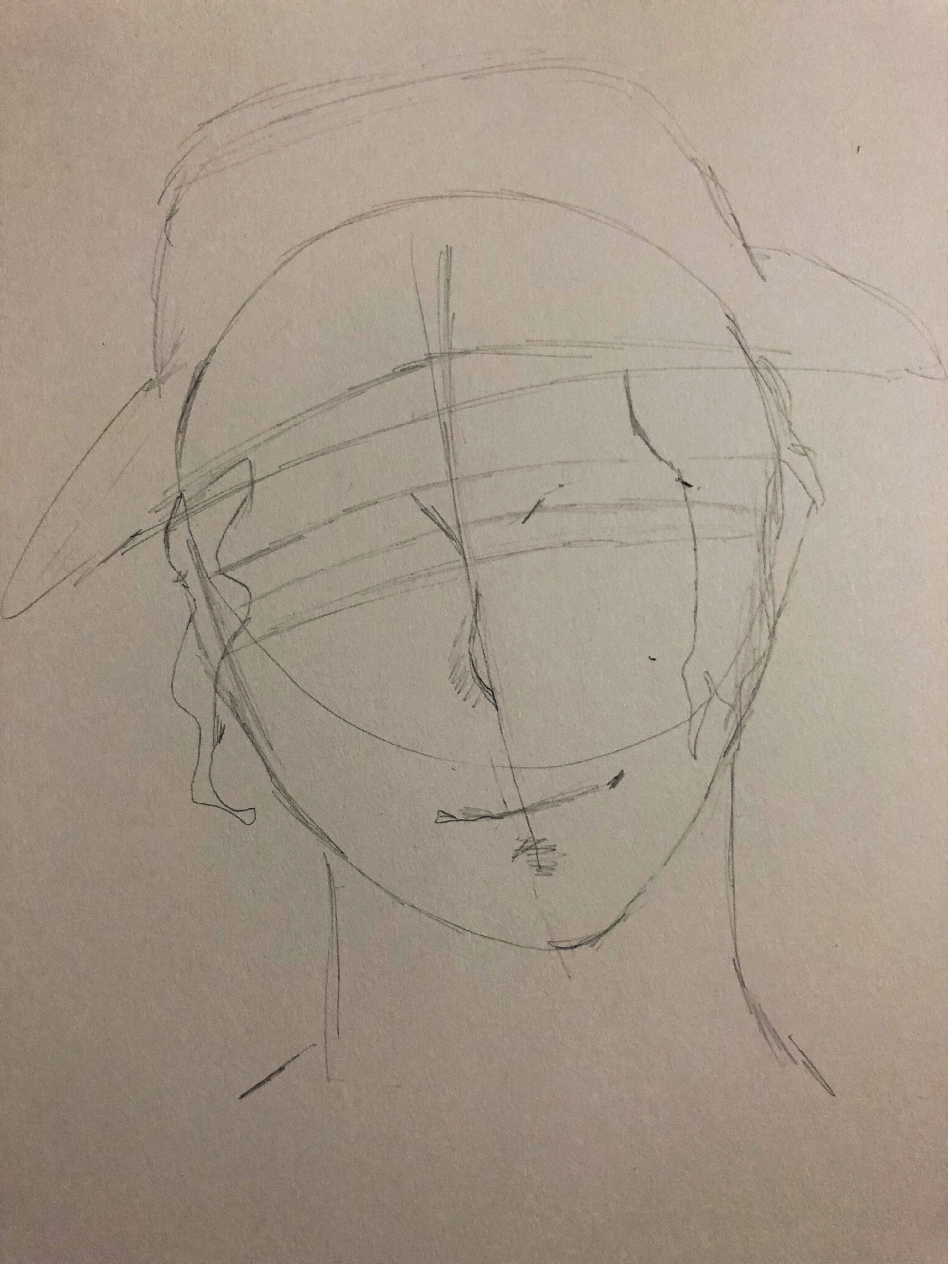 Empezamos con el boceto, es decir, los primeros bosquejos del dibujo. Para esto usamos el lápiz 2H y tratamos en la medida de lo posible no afincarse mucho en la hoja. Hacemos un círculo del cual sacamos la mandíbula y el cuello; las líneas de en medio funcionarán como guía para ubicar los ojos y las demás facciones. Definimos la nariz y hacemos la primera silueta del sombrero guiándonos por el mismo círculo central.
