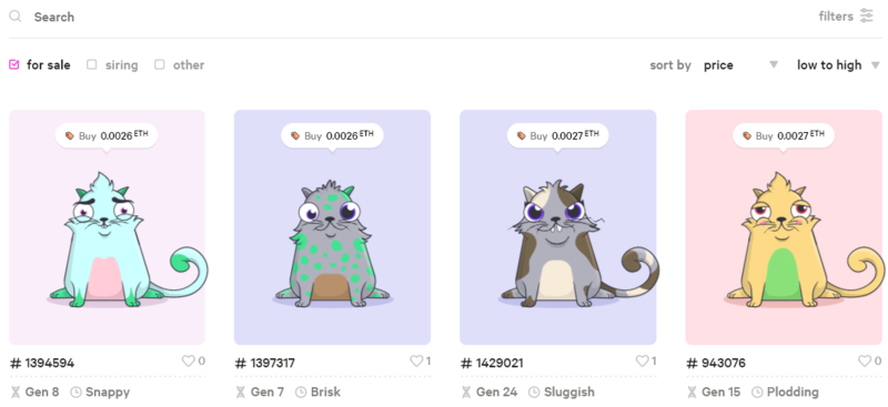 After the tutorial, your next destination is the Official CryptoKitties Marketplace - you’ll see the kitties that other users have bred and put up for sale!