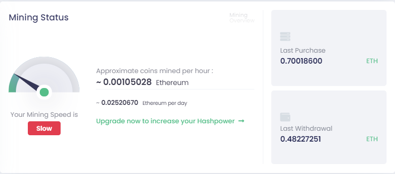 Once I got convinced by the daily and effective mining of my favorite cryptocurrencies (BTC and ETH), I invested a higher amount by releasing my first contracts, withdrawing my earned cryptocurrencies and reinvesting it in purchasing a faster hashing power.