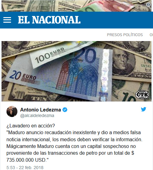 El documento señala también que cuando alguien quiera cambiar su petro, se pagará el precio del barril pero en bolívares, la moneda nacional venezolana, muy devaluada por la hiperinflación que atraviesa el país.