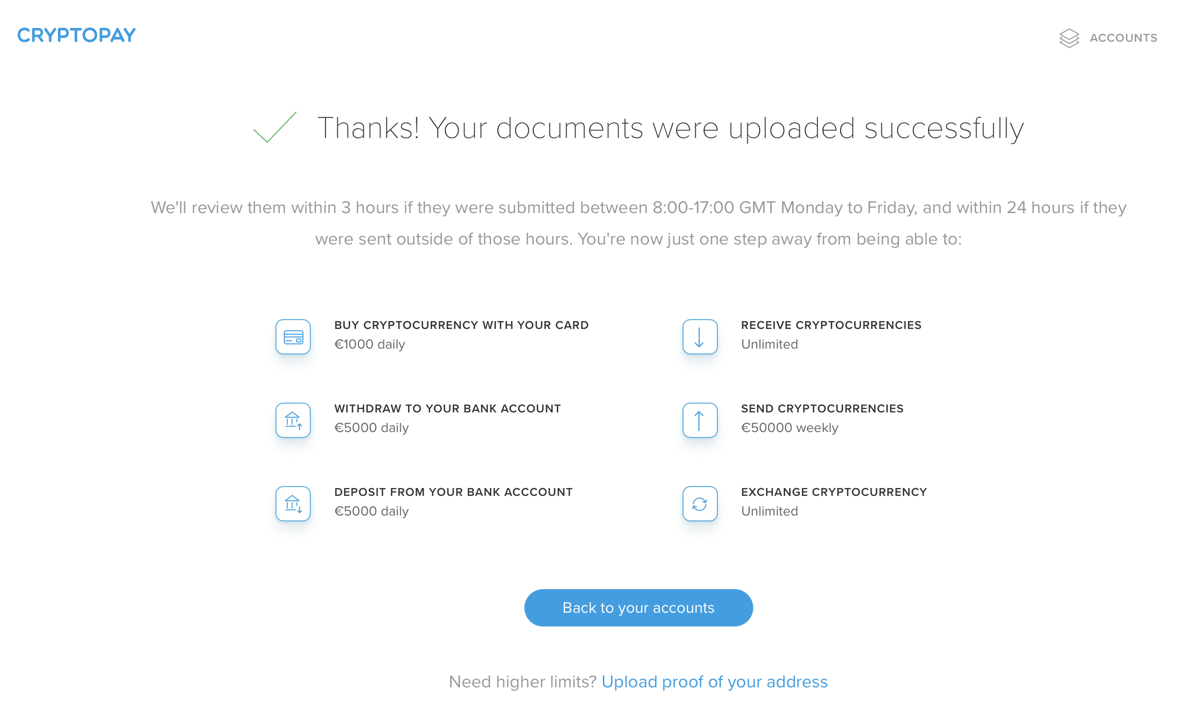 Cryptopayに登録してみました。欧州の銀行のIBANを持ちながら、プラットフォームからの暗号通貨のATM引き出しができるVISAキャッシュカード(プリペイドのデビットカード)を比較していて見つけました。本人認証としてパスポートの写真を2枚提出すると、ご覧のとおり、確認画面が出ました。