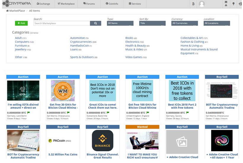 A unique feature of Cryptopia is the inclusion of a marketplace where users can buy and sell items, post auctions and wanted ads – a bit like eBay or Facebook buy and sell groups. Most of the items listed are Crypto-related, such as mining contracys, ICO guides, currencies, trading bots and other pieces of software.