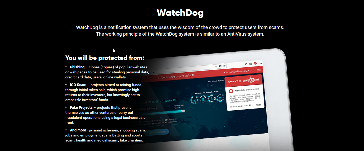 WatchDog will become our helper and ally, it will let us know when we visit a phishing site or stumble upon someone's fake social media page (with this platform everyone can protect their social media page by reporting and verifying their authenticity).