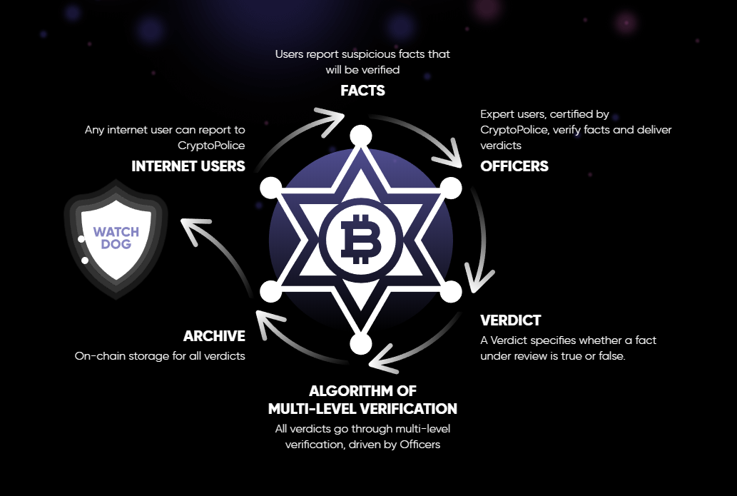 In short, the main idea of the CryptoPolice is to protect the average user from Internet fraud by means of each participant of the Internet, based on a system of motivation, multi-level verification of input data, and the preservation of information in the blockchain.