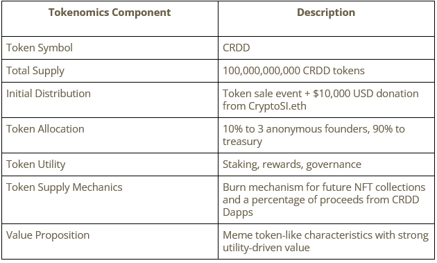 The CRDD token offers a unique value proposition that combines the appeal of a meme token with the utility-driven value of a governance and rewards token: