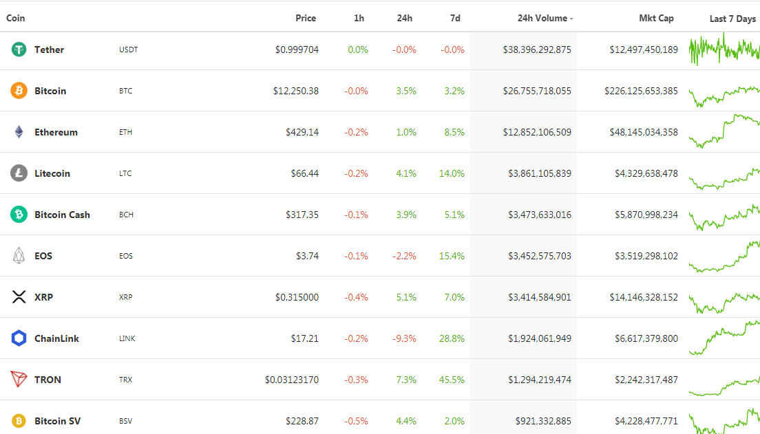 The above represents our top ten coins for today. From the image, USDT is leading the list at a price of $0.9997 with a daily price change of 0.00% while bitcoin follows second at a price of $12,250.38 with a daily price change of +3.5%. Ethereum and litecoin follows the list at a price of $429.14 and $66.44 with a daily price change of +1.0% and +4.1% respectively while bitcoin cash follows the list at a price of $317.35 with a daily price change of +3.9%. EOS and XRP follows the list at a price of $3.74 and $0.315 with a daily price price change of -2.2% and +5.1% respectively. Chainlink and Tron comes at number 8 and 9 at aprice of $17.21 and $0.03123 with a daily price change of -9.3% and +7.3% respectively. Bitcoin satoshi vision closes our list as indicated above at a price of $228.87 with a daily price change of +4.4%. With the price change of our top coin change tomorrow to a positive or negative value? I think the price change will be based on buyers and sellers behaviour. If the sellers volume will be high then the market will move upwards with few buyers thus causing the price change to positively change while if the buyers volume will be high then the market will move downwards with few sellers thus causing the price change to negatively change