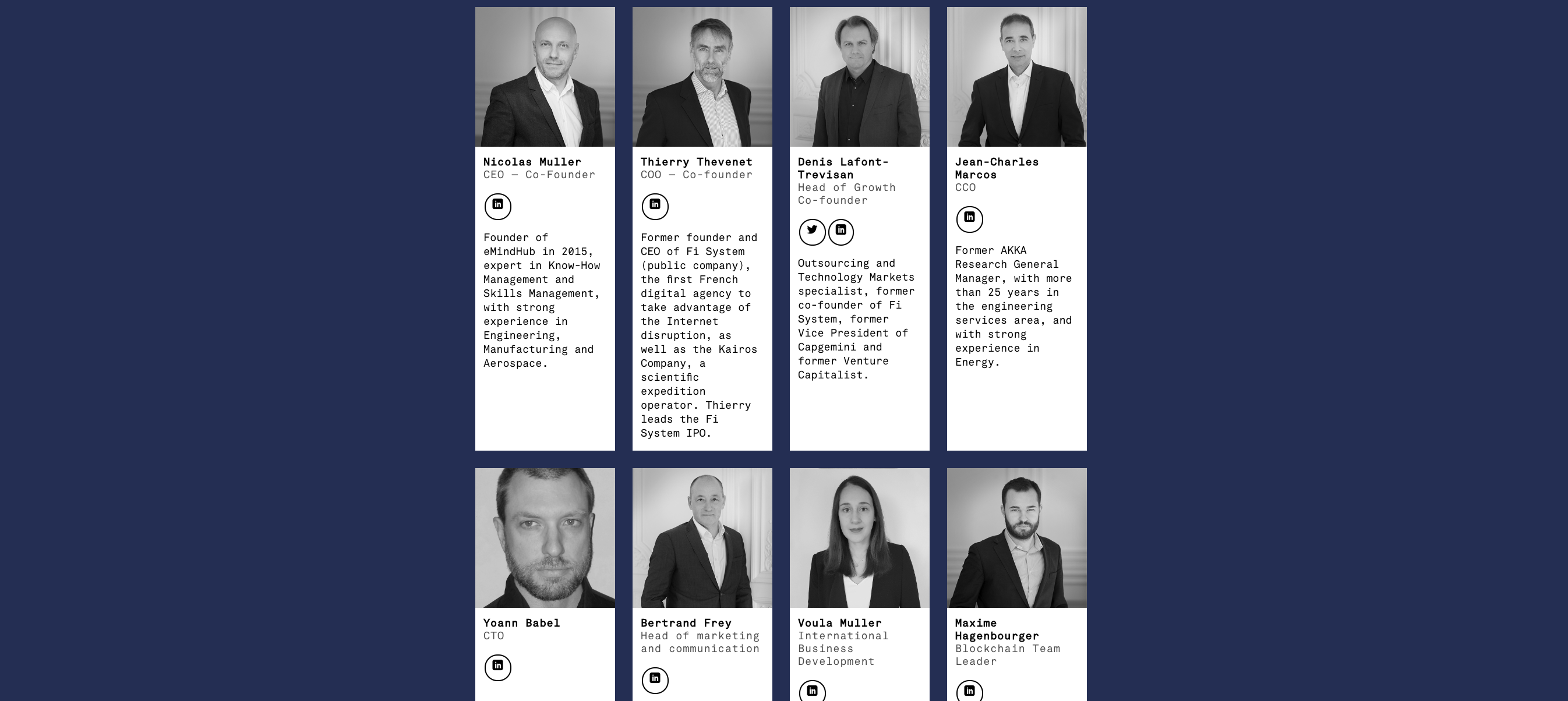 As part of the Talao platform project team, there are specialists who have developed the resource eMindHub, which already at the moment provides cooperation between highly professional specialists and companies. The Talao platform should ensure the transformation of this resource into blocking technology. All senior management is located in France. The top management of the Talao platform has experience in placing shares, marketing, managing and creating similar platforms, management, stock and crypto-currency markets.
