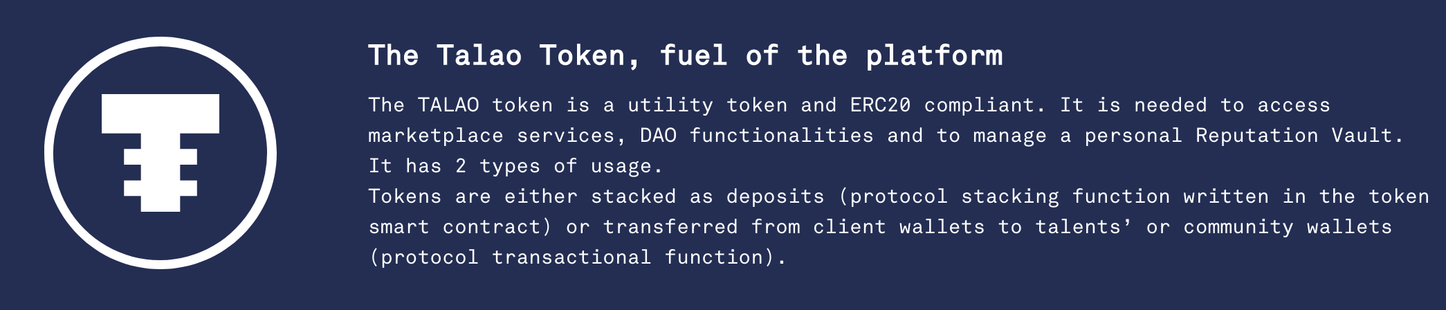 The TALAO Token is a utility token and ERC20 compliant. It is required to access marketplace services, to participate in DAO processes and to manage the Reputation Vault. It has 2 types of usage. Tokens are either stacked as deposits (protocol stacking function) or transferred from client wallets to talents’ or community wallets (protocol transactional function).
