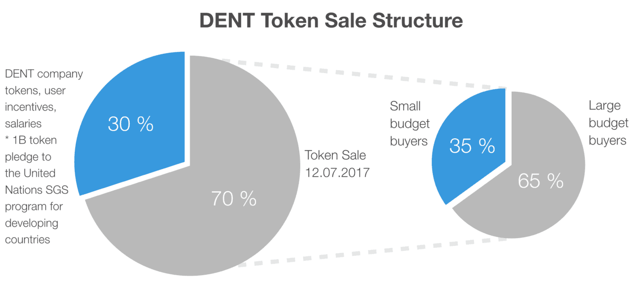 There will be a sale of 70% of the maximum supply of DENT Tokens . The distribution of the tokens is going to start after the token sale finishes. The total supply of DENT Tokens is going to be 100 billion, which means 70 billion tokens will be sold during the token sale. In addition, a minimum of 35% of the sale will be reserved to purchasers with smaller budgets.