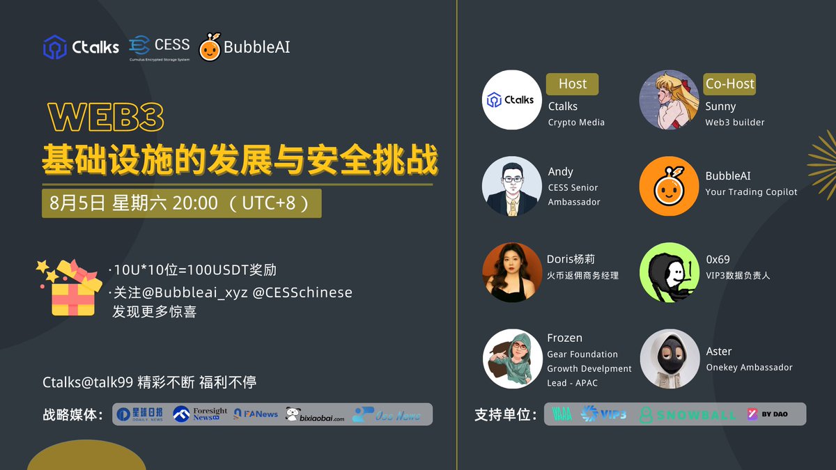 web3基础设施的发展与安全挑战dalin998 (50)in Ctalks • 3 years ago web3基础设施的发展与安全挑战,8月5日 开麦一起来聊 感谢@Bubbleai_xyz @CESSchinese @CESS_Storage 提供的100USDT奖励 👉BubbleAI 你的智能交易助理 👉CESS 第一个支持大规模商业存储的区块链网络 https://denet.me/m/SR1x5g #ctalks #ann #Giveaway #Airdrop #CESS #iweb3 #ctalks #ann #Giveaway #Airdrop #CESS