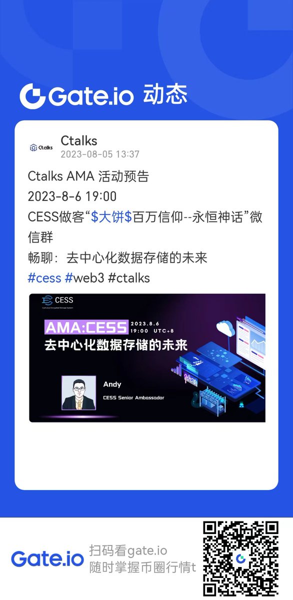 Ctalks AMA 活动预告👇tokenfly888 (50)adminin Ctalks • 3 years ago Ctalks AMA 活动预告👇 ⏰2023.8.6 19:00 UTC+8 Ctalks特邀CESS大使 @AndyZou_CESS 做客“大饼百万信仰--永恒神话”微信群 畅聊:去中心化数据存储的未来 #cess #ctalks #ann @CESSchinese @CESS_Storage #cess #iweb3 #ctalks #ann