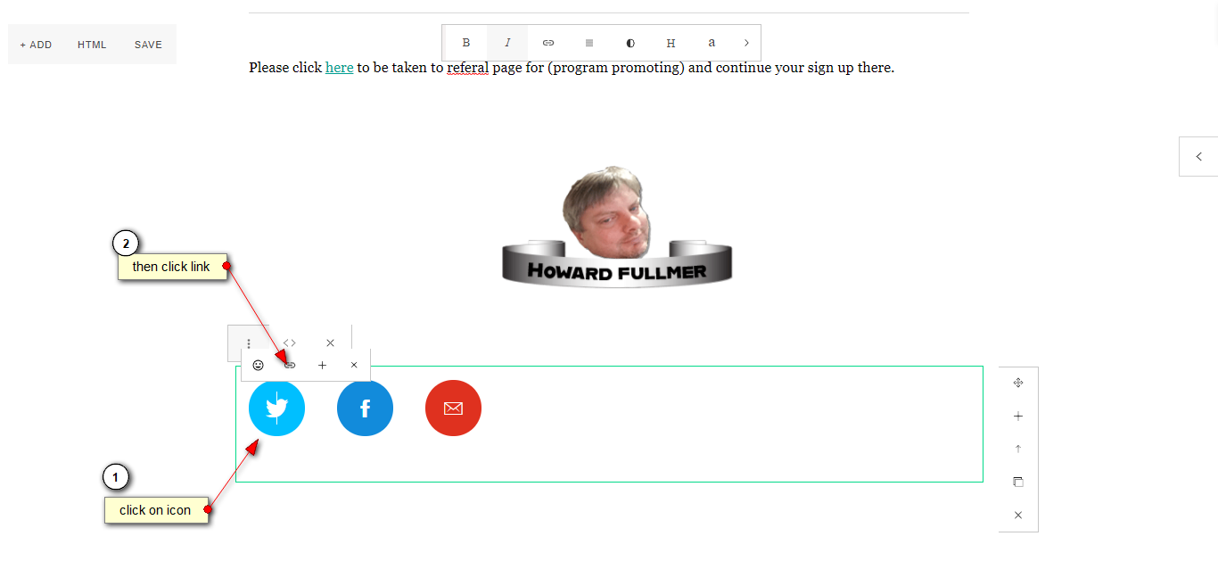 Now you want to add social media buttons so people can follow you there. You do this by clickin the + and going to more again and there are two type of social buttons you can choose from .