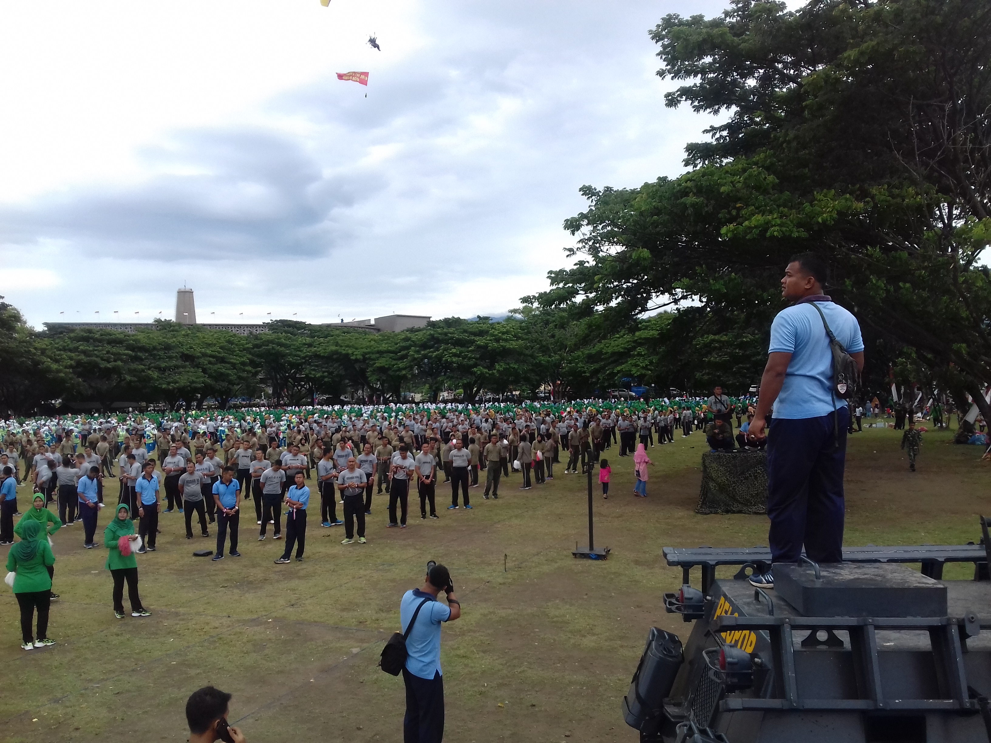 Tak terkecuali anggota TNI, warga Banda Aceh dan Aceh Besar pun ikut membaur dengan jajaran TNI di lapangan Blang Padang, Banda Aceh Selasa (04/09/2018).