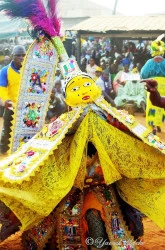 This is the most expensive aspect of the festival. “Eku” is the Yoruba name for masquerade costumes. The people of Agbowa-Ikosi go as far as importing the material for the costume from abroad. The costume for non masquerade can cost as much as two to five million naira. Colourful designs are embroidered on the costume. According to my informant, when the festival first came to Agbowa, women’s old wrappers were used as costume. With the arrival of modernity, the costume changed and beautiful designs are being made on the costume. The costume also includes a mask with a feminine face. It is believed that the masquerade is a female, so the mask is also made with afeminine face and plaited hair. The masquerade also holds a sword and horse tail known as “Irukere” in Yoruba language. The sword is used by the masquerade to make way for itself. The audience gets carried away with its performance and they constitute an obstruction which prevents the masquerade from dancing round the square. It wields the sword in order to scare people back, thereby making a way for itself. The horse tail is used to add to its majestic aura. There are also rattles tied to the masquerade’s legs. The rattle is called “Ide” in Yoruba. It is used to announce its presence and also to keep it in tune with the drum.