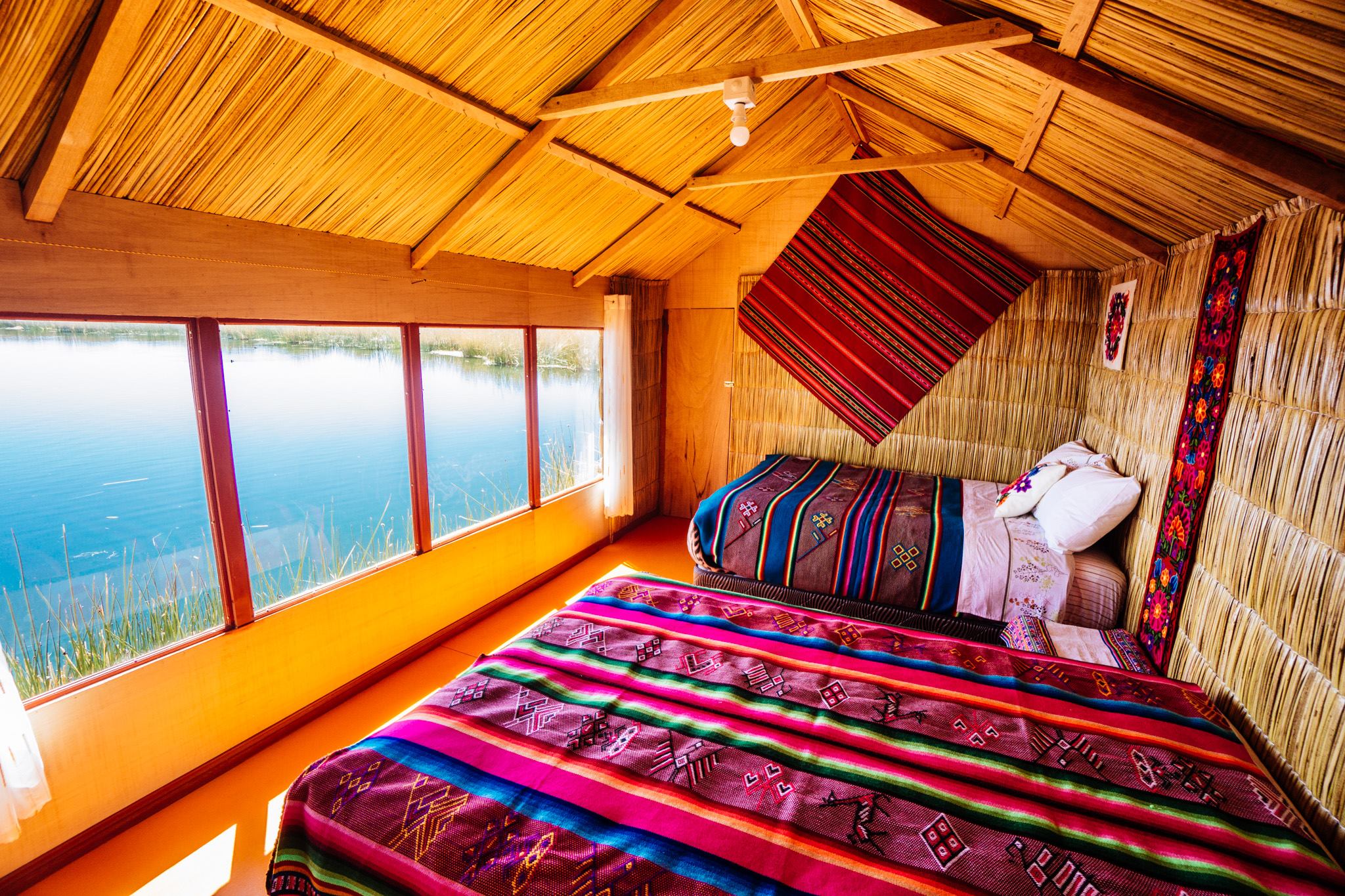 The main mode of making a living on the floating islands is fishing, building boats and selling handicrafts. Traditionally the rooms at the floating islands used to look like this. But they didn't have much space inside.