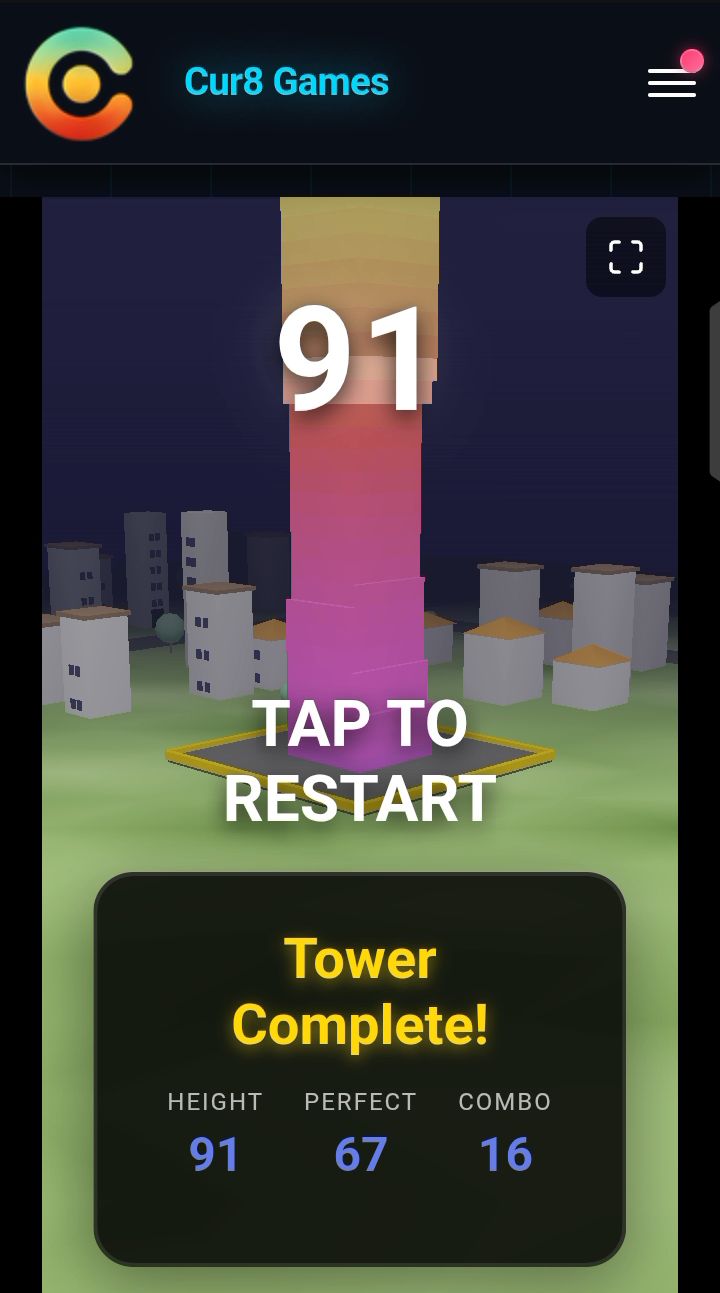 The game dynamics and game play is very simple, stack blocks and make the tallest tower that you can. But levels become harder and harder and the amount of room you have to make errors get less and less. My most recent run, I was able to do so and hit a height of 91, which required a lot of concentration and is a huge milestone for me.