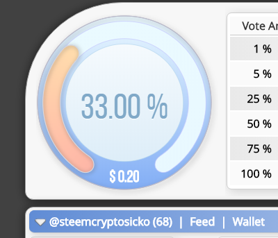 A 1000 SP delegation gets a daily 33% upvote from CryptoSicko. This is currently worth 0.20 STU.