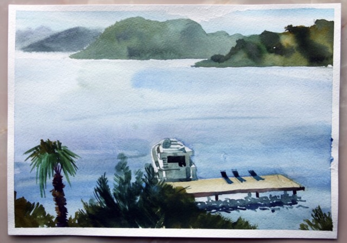 Our final feature today is a landscape watercolor painting, complete with progress pictures, just released this morning. Mister-omortson is staying in a hotel somewhere in the US (he declined to tell me where) with a “sea view room.” This is the view from his balcony—check it out: