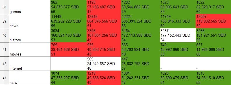The red cells indicate that the average SBD/post payout has decreased compared to the previous week, the green cells indicate that the average SBD/post payout has increased compared to the previous week, the white cells indicate that the average SBD/post payout has remained the same.