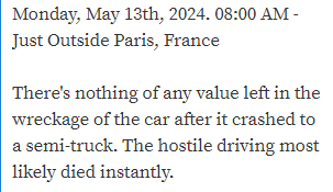 There's nothing of any value left in the wreckage of the car after it crashed to a semi-truck. The hostile driving most likely died instantly.