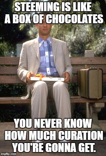 The other day, I noticed I had over 20 upvotes on a post. The post itself made under 0.10, but the fact that I had so many people who saw it, read it, enjoyed it, upvoted it, felt nice and sweet. Sure, the curation is fun, that's why we like the special chocolates, but the regular chocolates that come up in all the boxes, they are always there and will always be there. Sure, I'd love to find a rare one, but I like that there are those flavours (followers) that are always there and I can count on those lovely chewy ones.