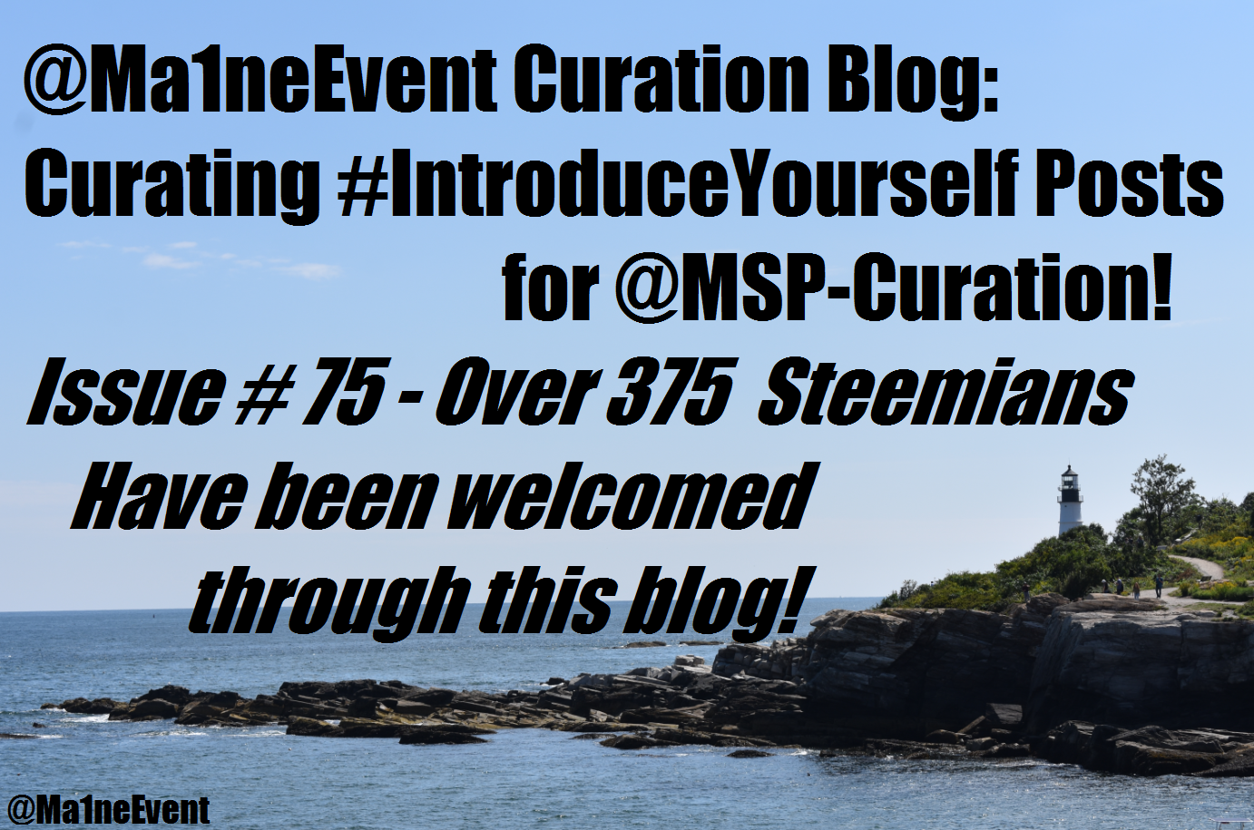 Welcome to my Curation blog. Each week I try take a look in the # introduce yourself tag to find five new Steemians to share with you in a curation post. These new users have authored Introduce Yourself posts, which tell us a bit more about themselves. Join me in welcoming them to the Steem Community!