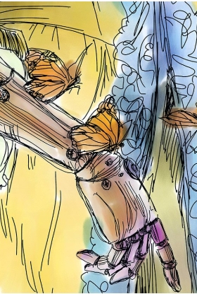 I was more than a little enchanted by this study by Donna. At first sight, I saw the victorian lady and all the butterflies and thought, Ooh, pretty ... But then I scrolled down further and saw the robotic arm, which opened up all sorts of stories in my mind.