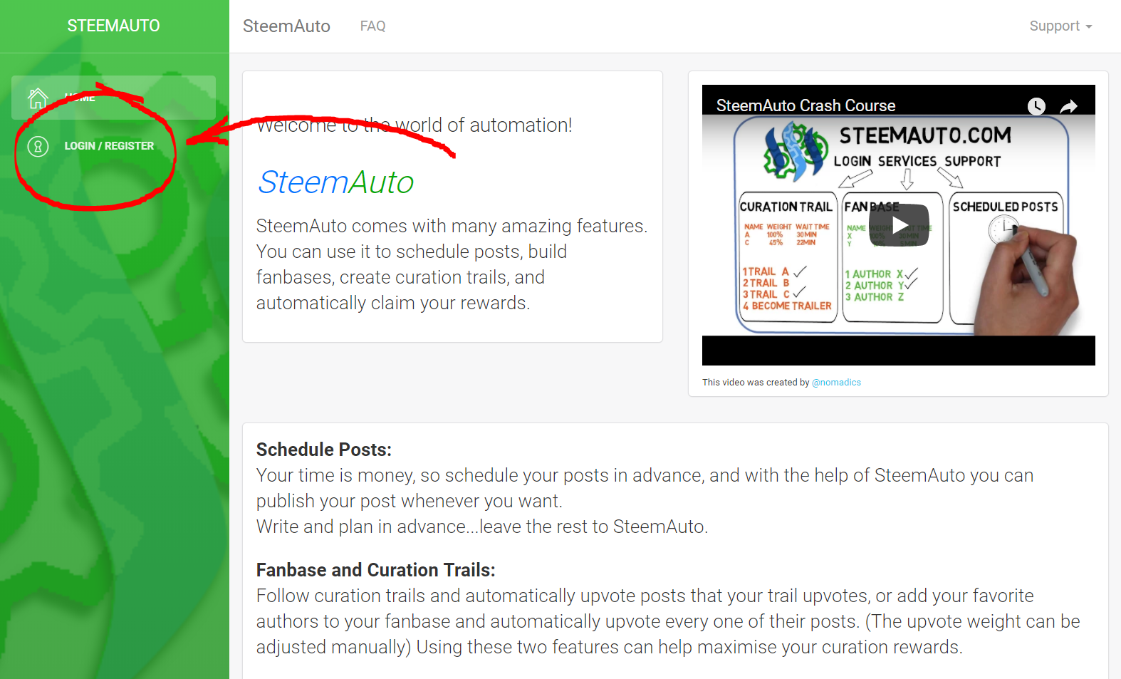 On the bar on the left side of the page, click "LOGIN / REGISTER" and log in using STEEM CONNECT.