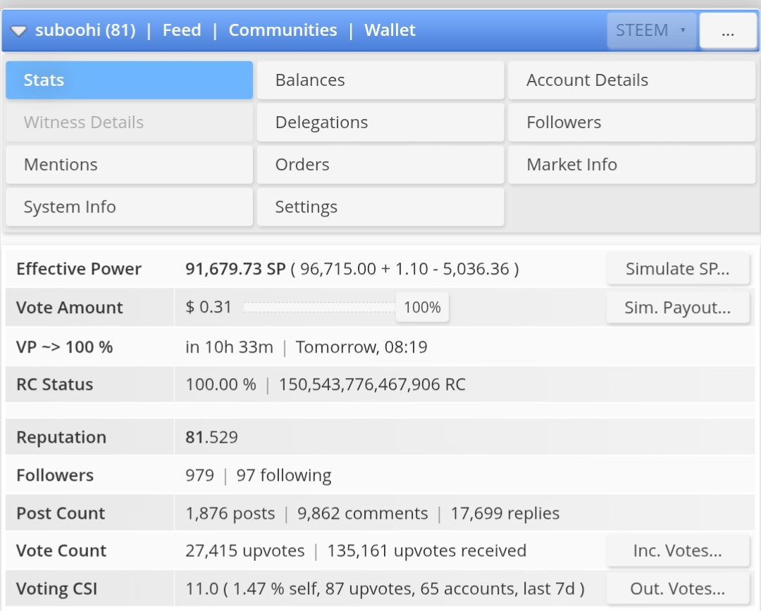 | @suboohi | Pakistan | 96,714.99 | 81.529 | 11.0 | steem-seven |