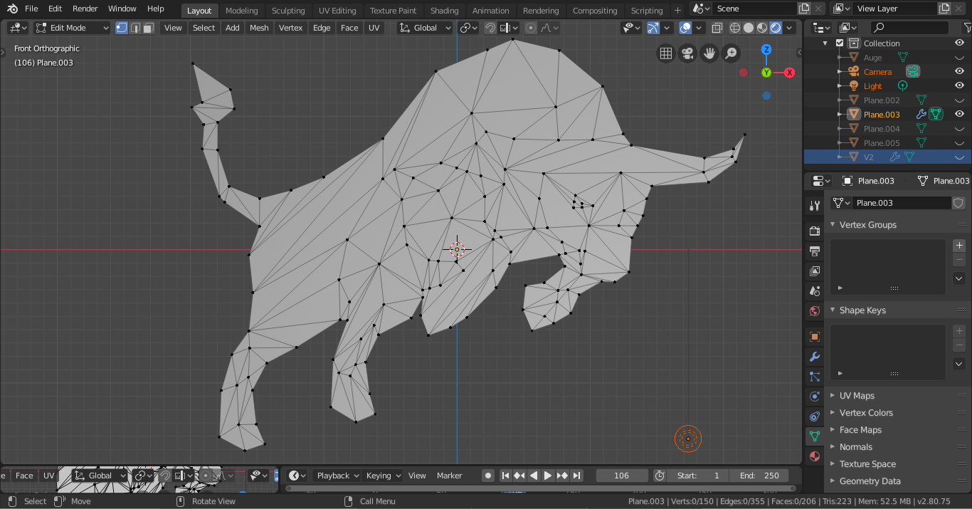 Nun die Ebene mit Polygonen füllen. Dabei versuchen, dass die Linien/Grenzen der Polygone schon den Körperverlauf des Bullen abbilden. Wer genau hinschaut, kann schon jetzt Beine, Kopf, Hörner usw. sehen.