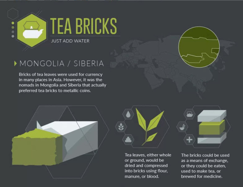 Çay yapraklarının tuğlaları, Asya'daki birçok yerde para birimi için kullanıldı. Bununla birlikte, Moğolistan'da ve Sibirya'da aslında metalik paralara çay tuğlasını tercih eden göçebeler idi.