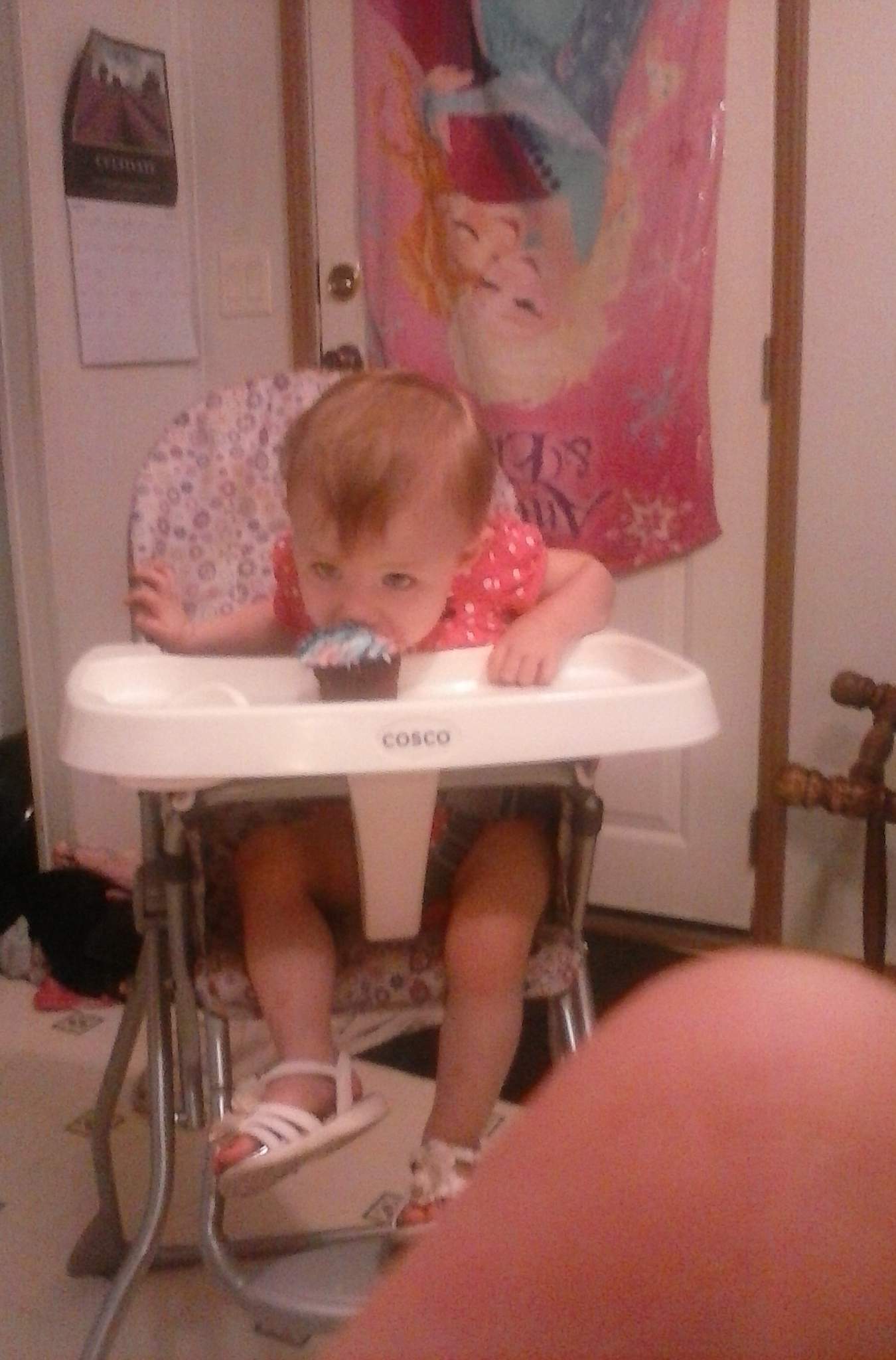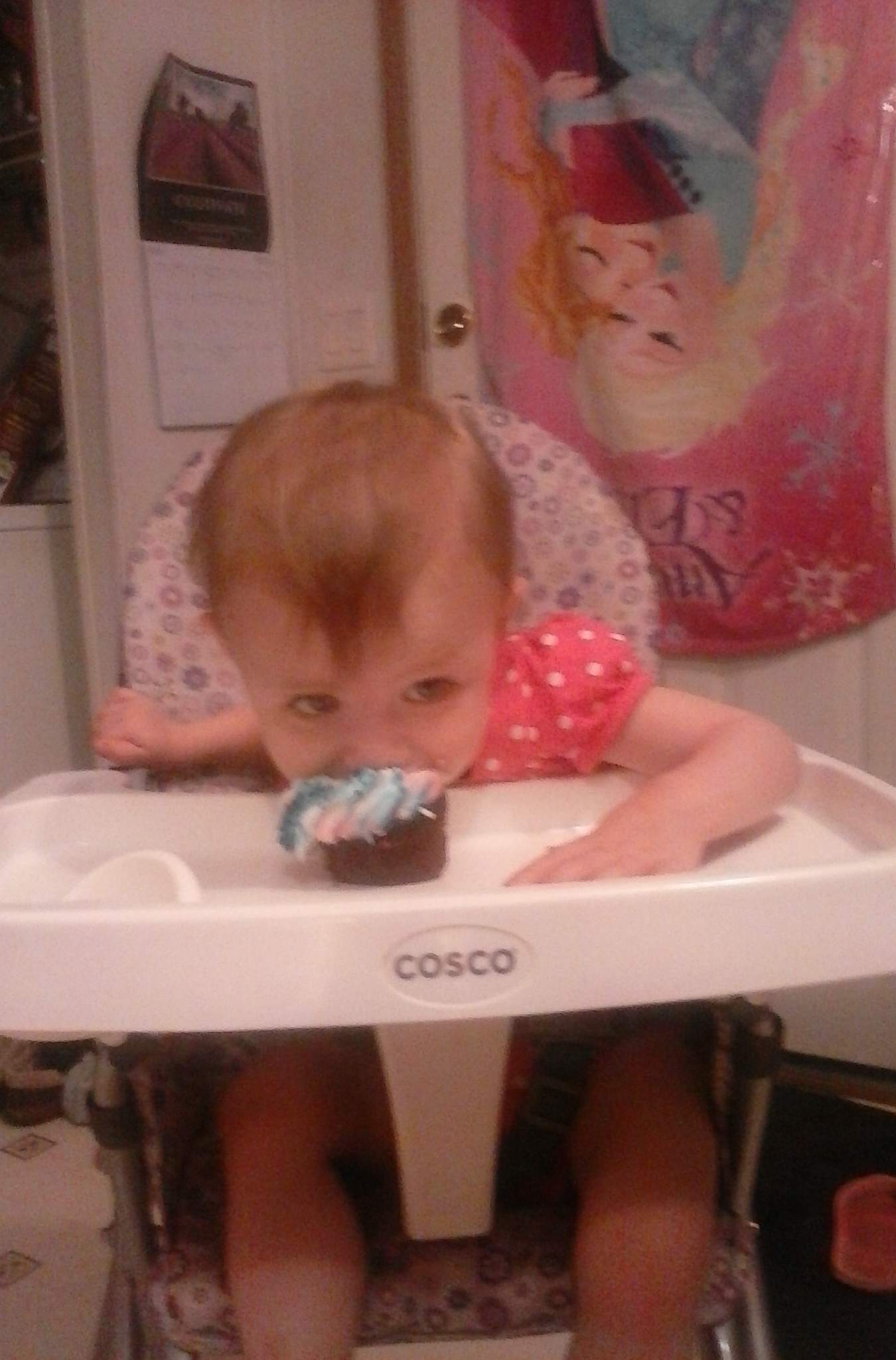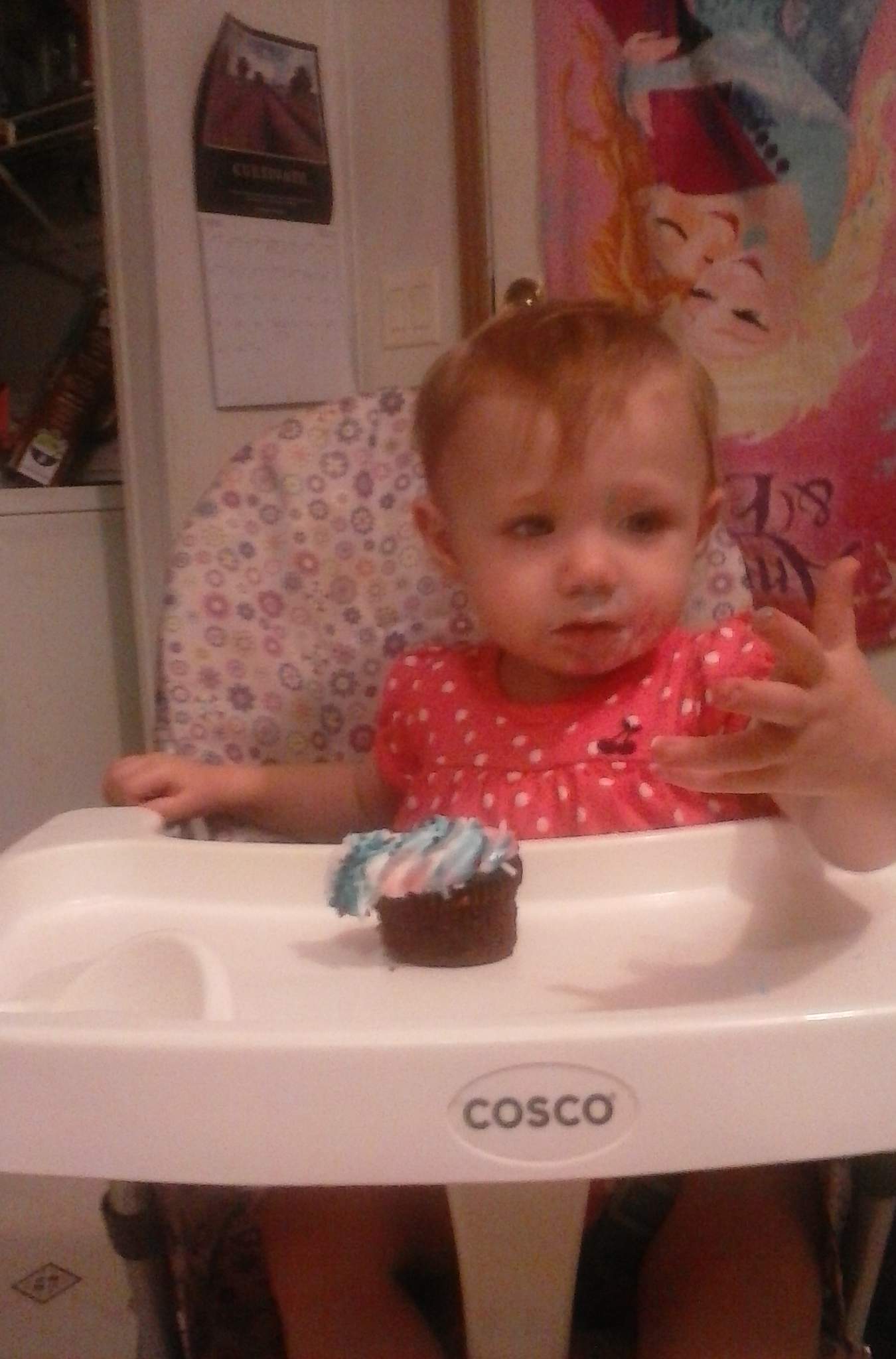 I got cupcakes from the bakery down the street from where I live. My daughter touched it with her hands, and didn't like it on her fingers. So watch how she solved the issue.