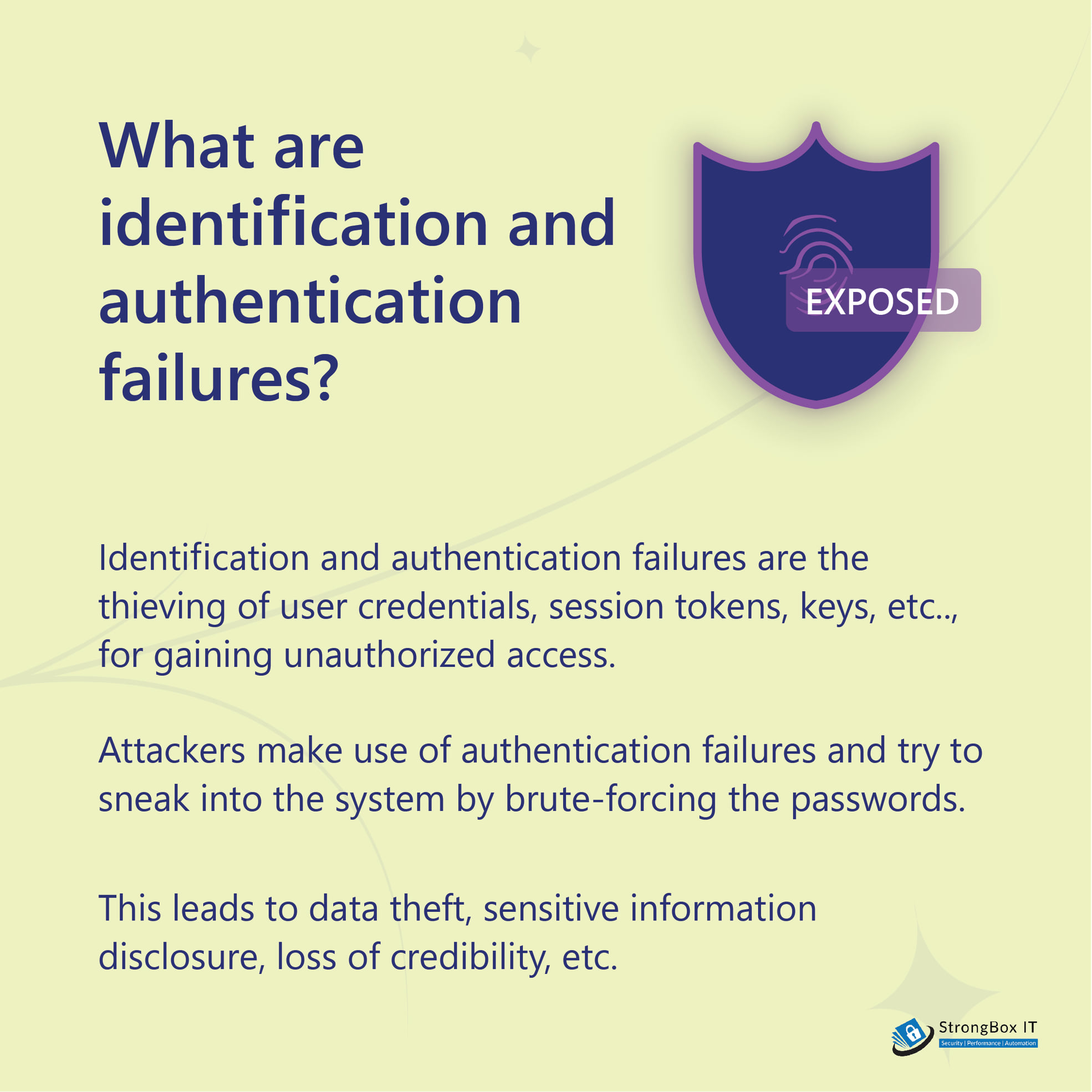 Identification and authentication failures are the thieving of user credentials, session tokens, keys, etc.., for gaining unauthorized access. These threats are inherent in online platforms and applications that enable the hacker to bypass the authentication. Attackers make use of authentication failures and try to sneak into the system by brute-forcing the passwords. It paves the way for data theft, sensitive information disclosure, loss of credibility, etc.