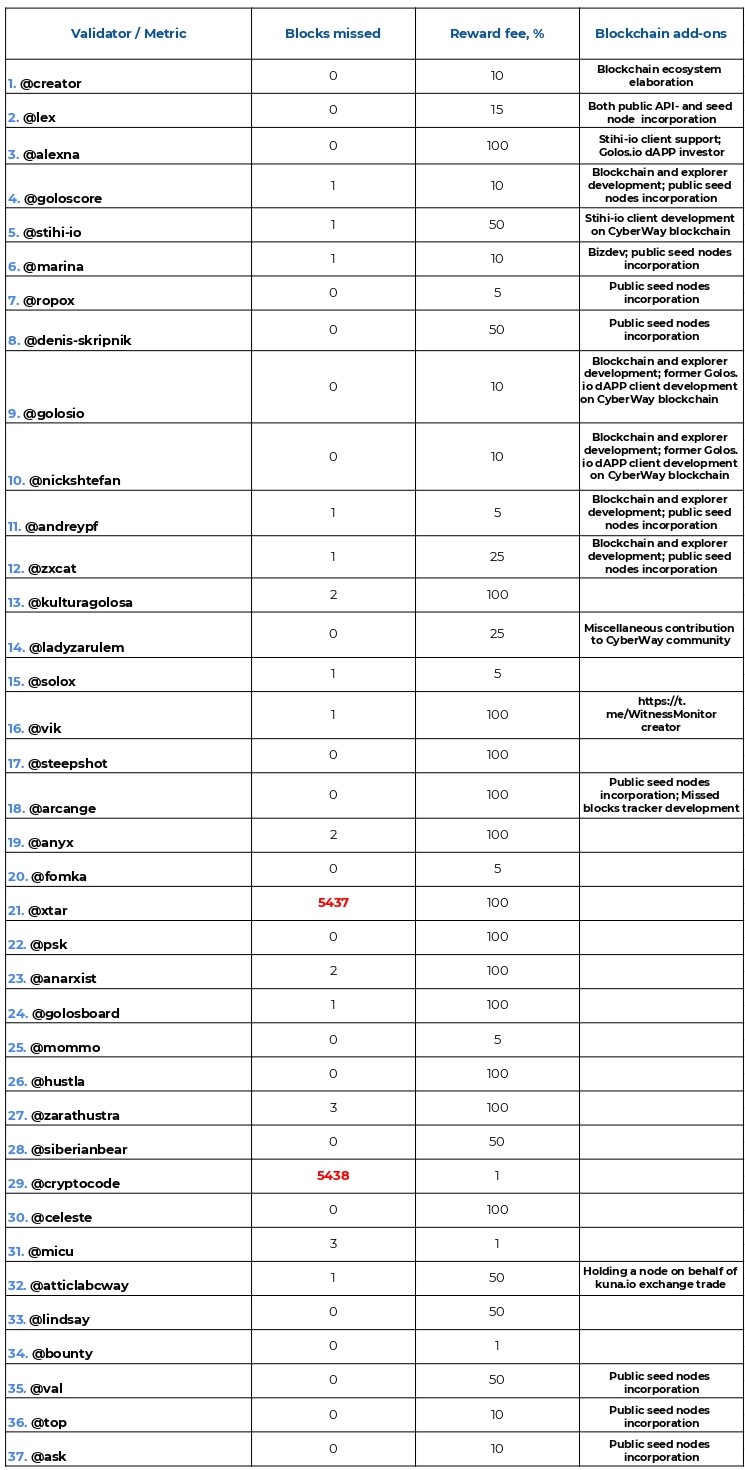 You can hop into our block explorer (https://explorer.cyberway.io/validators) at any time to track the productivity of validators. Each of our reports is to provide you with the most recent and coherent data for the last 7 days.