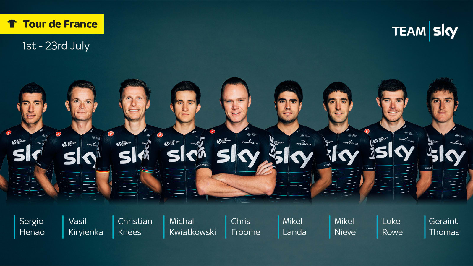 Drużyna Sky ogłosiła skład na Tour de France 2017, w którym Chris Froome ma za zadanie poszukać czwartego zwycięstwa w TdF, które byłoby jego trzecim zwycięstwem z rzędu.Froome będzie miał wsparcie w postaci Sergio Henao, Vasila Kiriyienki, Christiana Kneesa, Michała Kwiatkowskiego, Mikela Landy, Mikela Nieve, Luke Rowe i Gerainta Thomasa.