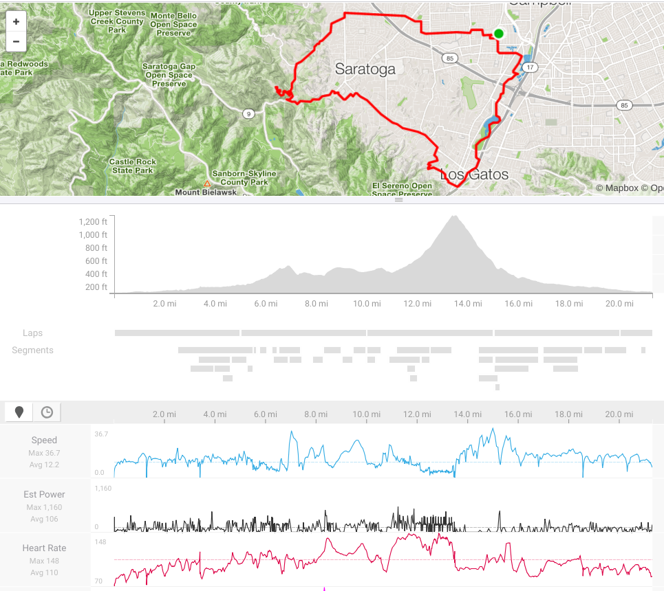 The ride was 21 miles and 1400 ft of climbing. There is a winery/concert hall named Paul Mason up in the Saratoga hills which I rode up to. There is a 'no cycling' sign at the front, but I went anyways... (breaking the rules...)