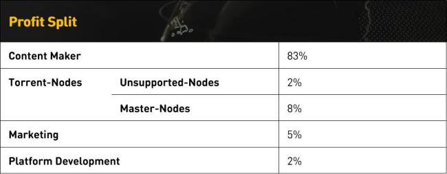 Their content is then rated by the Torrent-Nodes. Content which scores higher on the rating list will have a higher likelihood of being broadcast on air. The content maker receives 83% of the advertisement revenue, which has been pre-paid by the advertiser. Total profit will depend on the duration of the video, the category of the broadcast channel and the overall rating of the video itself, as decided by the Torrent-Nodes.