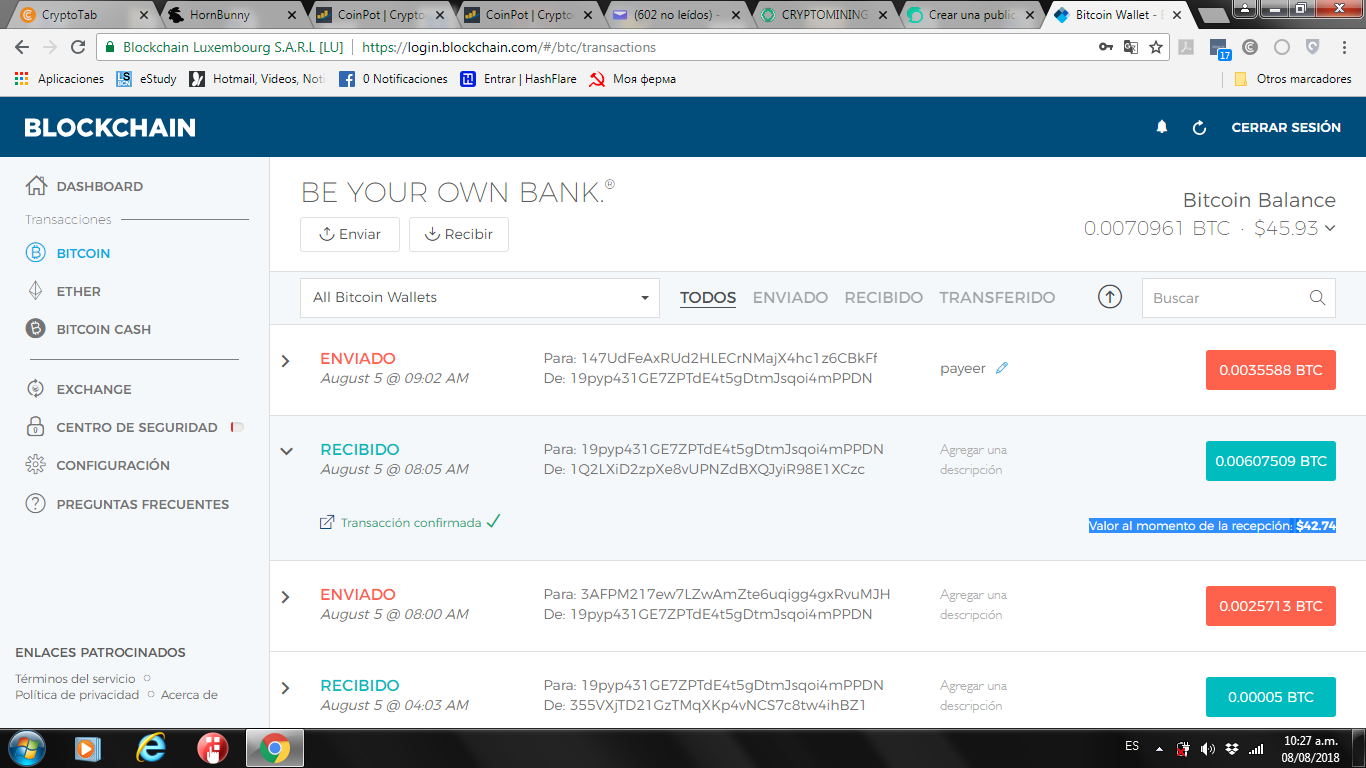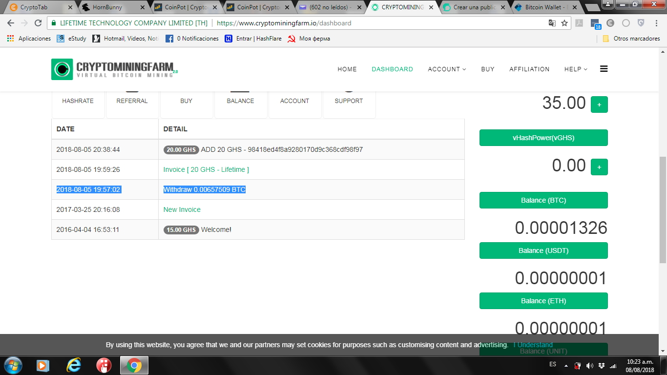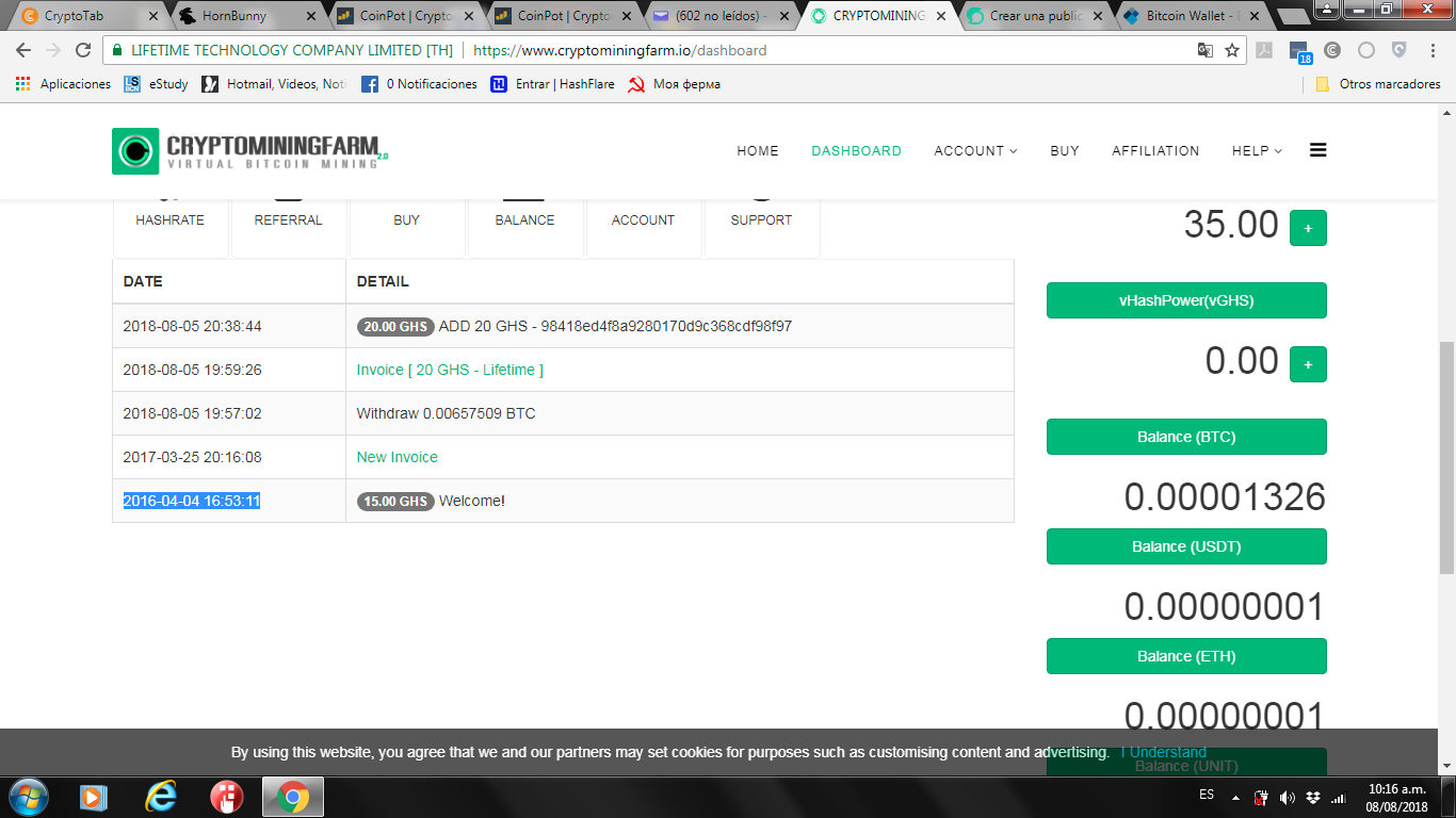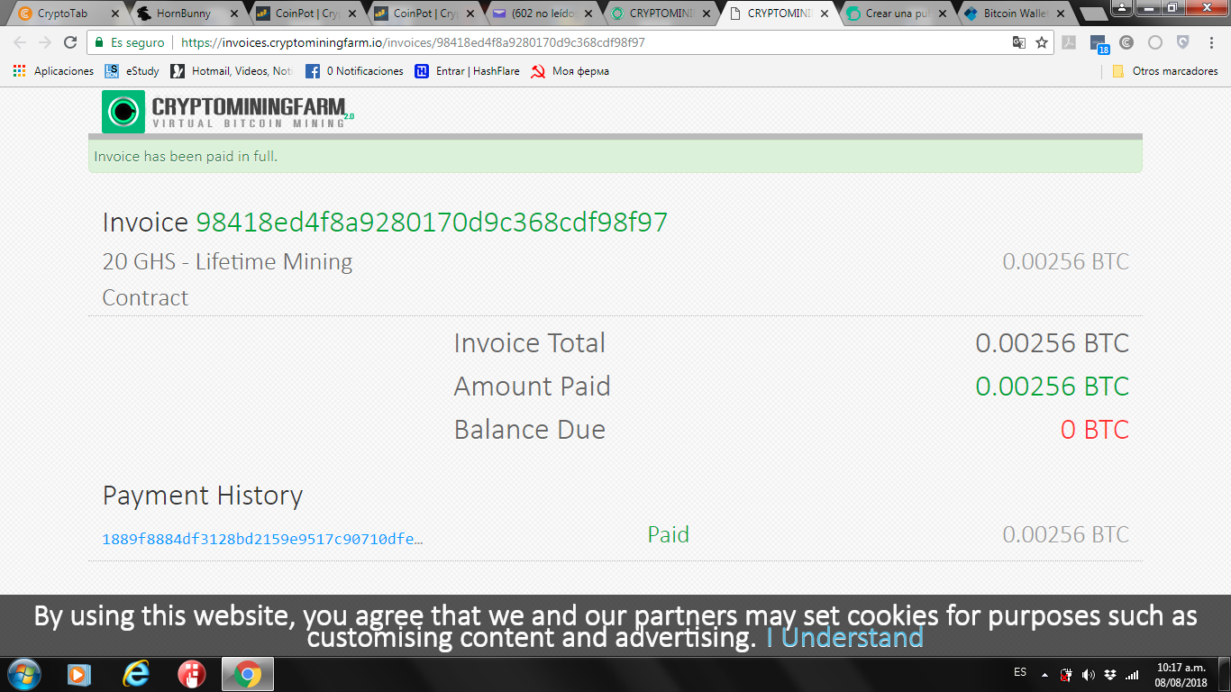 También se observa una inversión por 20 gigahash, realizada el dia 5 de agosto del 2018, anexo imagen de la factura ya pagada claro esta...