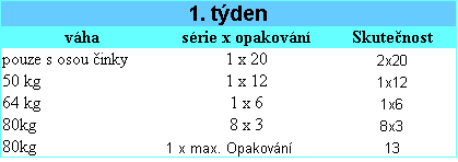 Jak jsem psal v minulém příspěvku tak dnes byl první tréning. Postupoval jsem přesně podle tabulky a asi nebude překvapení ,že jsem to v pohodě zvládl. Samozřejmě, že to nebude tak jednoduché postupem času. Ještě jsem si přidal rozpažování na stroji Peck-Deck 4x12 s max. zátěží .